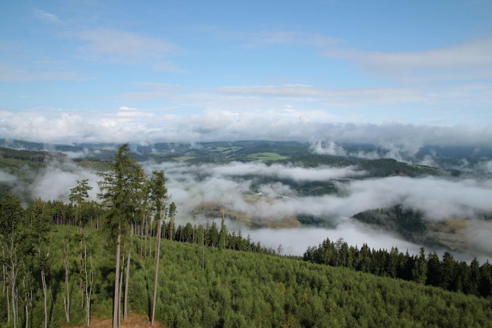 Wir gehen mit der Ringstraße nach rechts und verabschieden uns bald von dem Blick auf die Burg, dem Wäldermeer im Hintergrund und auch vom Märchenpfad und biegen in den Ratzenbergweg nach rechts ein. Zunächst laufen wir fast eben zur bayerisch-thüringischen Grenze, biegen dann links auf den Geierhorstweg ab, gehen mit diesem zügig bergan und freuen uns über den weiten, fantastischen Blick ins Thüringische. Am Scheitelpunkt biegen wir links ab und erreichen bald den 26,5 m hohen Aussichtsturm Thüringer Warte. Von oben bietet sich uns ein herrlicher Blick über den Frankenwald, die Rennsteigregion und den Thüringer Wald.